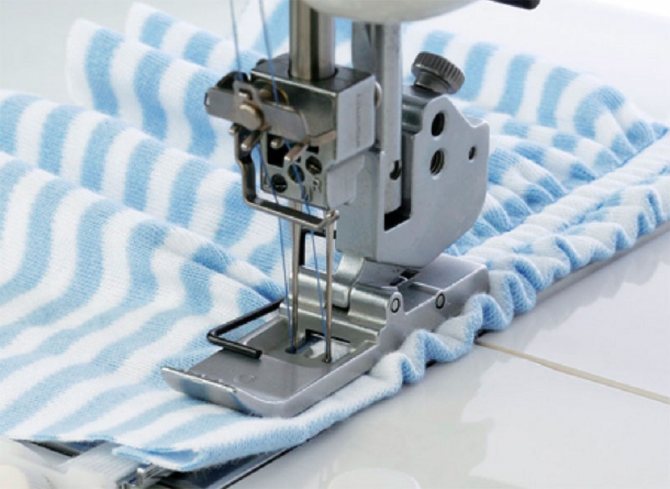 Перед пошивом тянущиеся нитки нужно заправить в катушку, а в качестве другой лицевой нити использовать обычные нитки. Если пошив производят простой прямой строчкой, то лучше приматывать ткань по нескольким частям отдельно. Так форма готовой одежды будет однородной и симметричной, она не будет собираться в одном месте складками, а в другом – натягиваться.