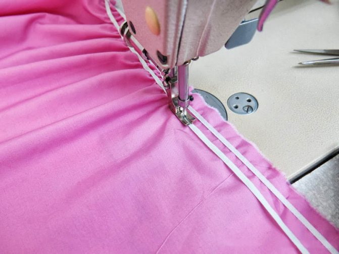 Стоит учитывать коэффициент сжатия нити, особенно при сборке материи на большом участке ткани. Такой способ широко применяется для обработки поясов и ремней юбок с брюками.